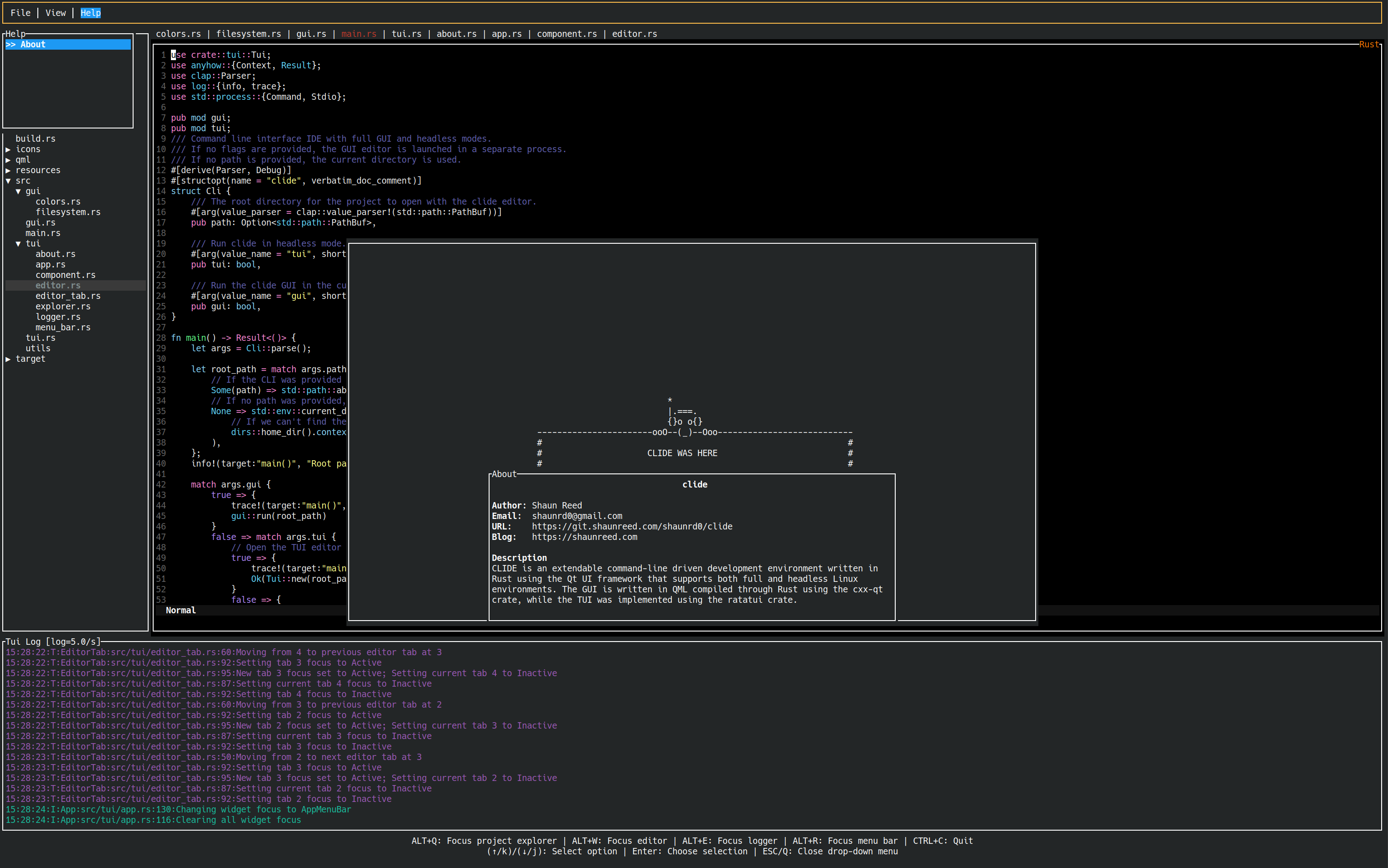 CLIDE is an extendable command-line driven development environment written in Rust using the Qt UI framework that supports both full and headless Linux environments. The GUI is written in QML compiled through Rust using the cxx-qt crate, while the TUI was implemented using the ratatui crate.